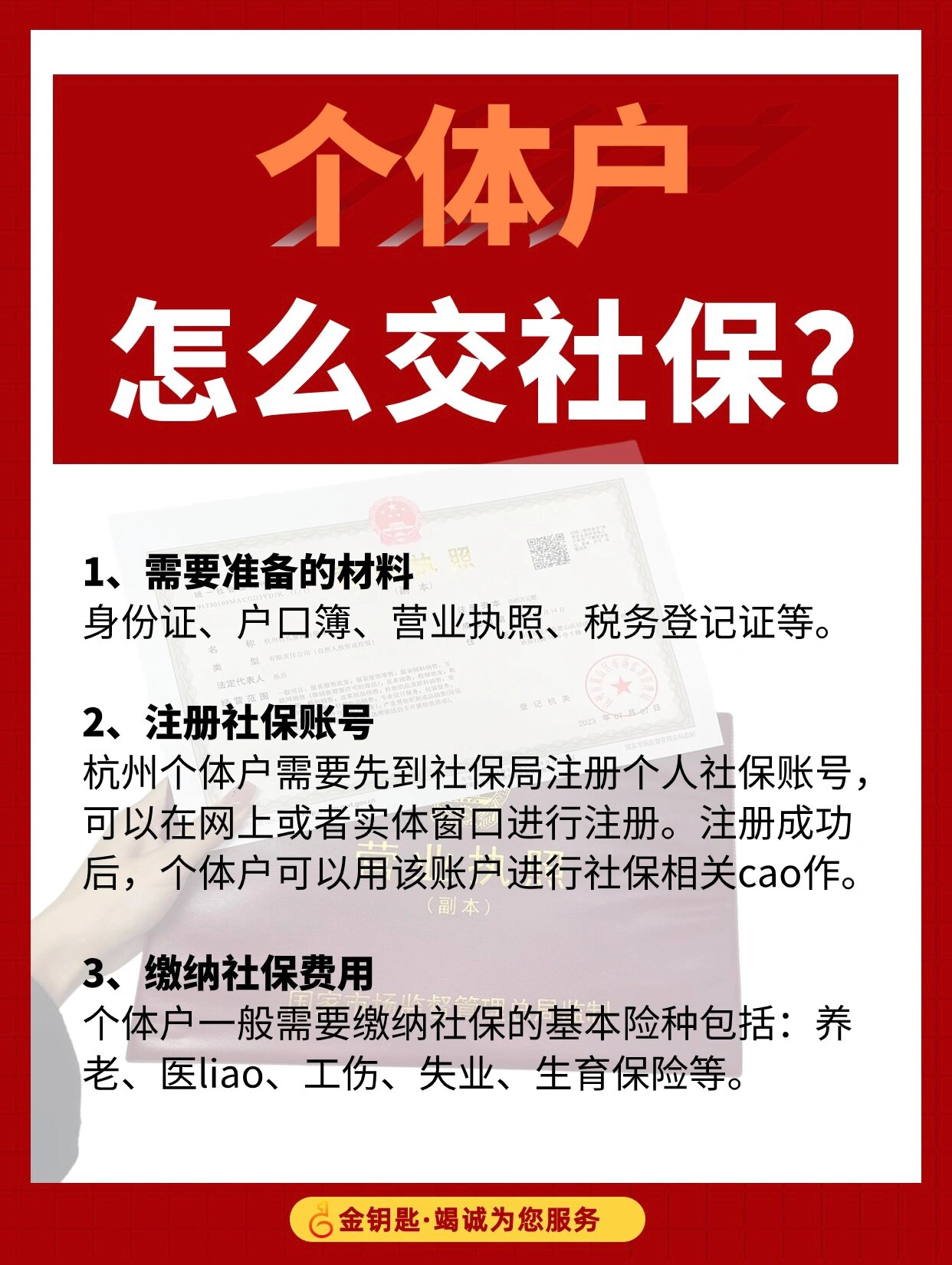 注册个体可以交社保么个体工商户可以交社保。注册个体工商户后,可以为自己和员工购买社保,包括养老保险、医疗保险、失业保险等。为个体及员工提供社会保障,有助于保障经营稳定及员工福祉。... 2025-12-03 - [阅读全文]